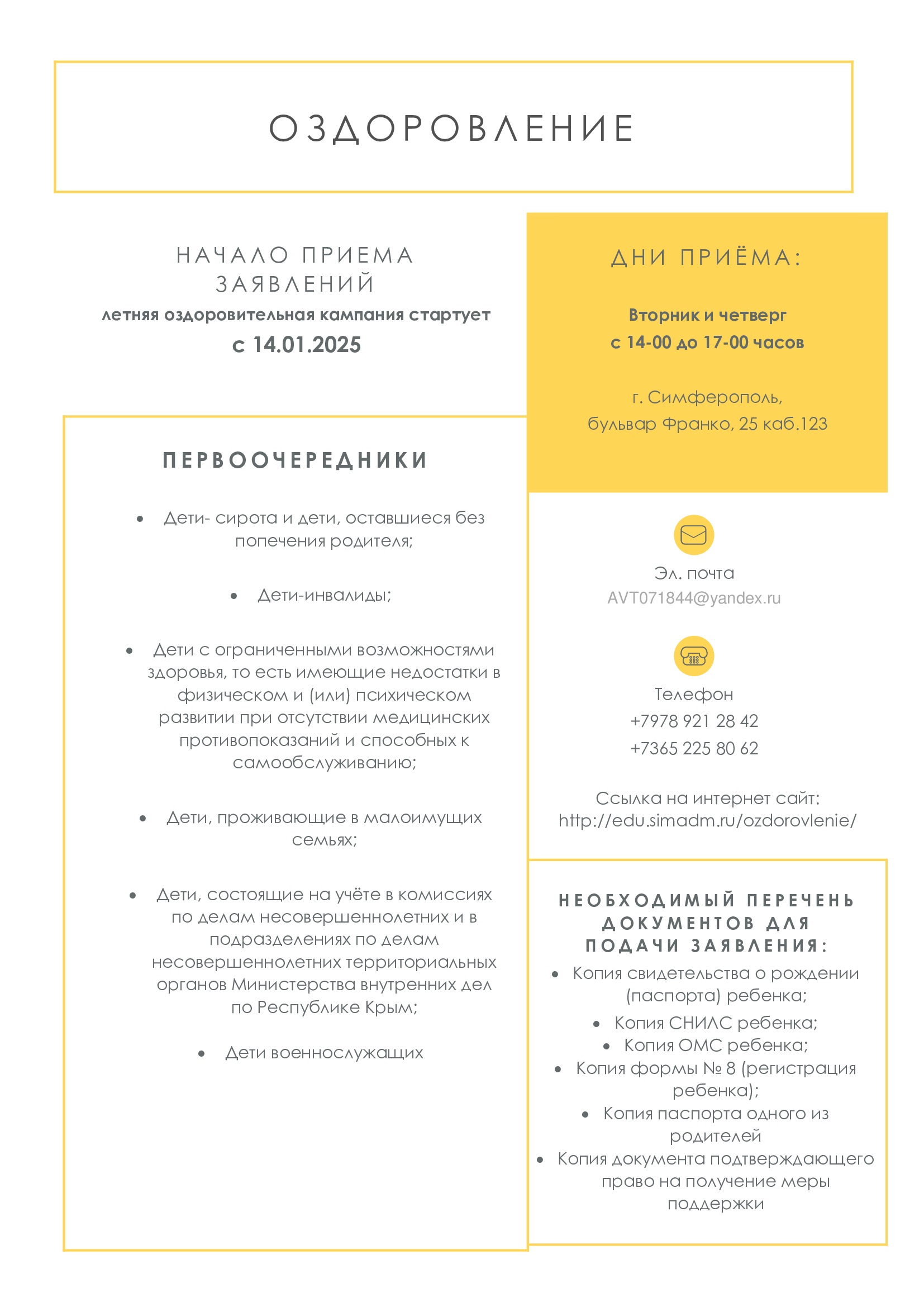 Прием документов на летнее оздоровление льготных категорий детей в рамках летней оздоровительной кампании 2025 года